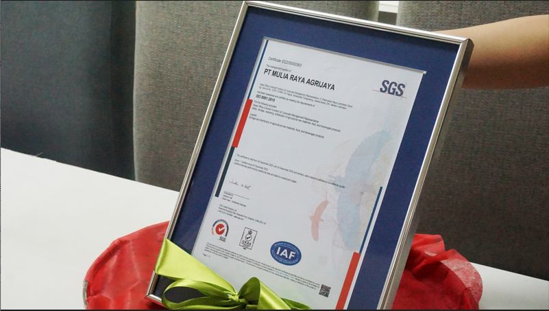 Dengan penerimaan sertifikasi ISO 9001:2015 menjadi awal PT Mulia Raya Agrijaya untuk terus berkomitmen melakukan yang terbaik dalam meningkatkan service dan mempertahankan quality sesuai standard international untuk para Partners dan juga para Customers setia.
